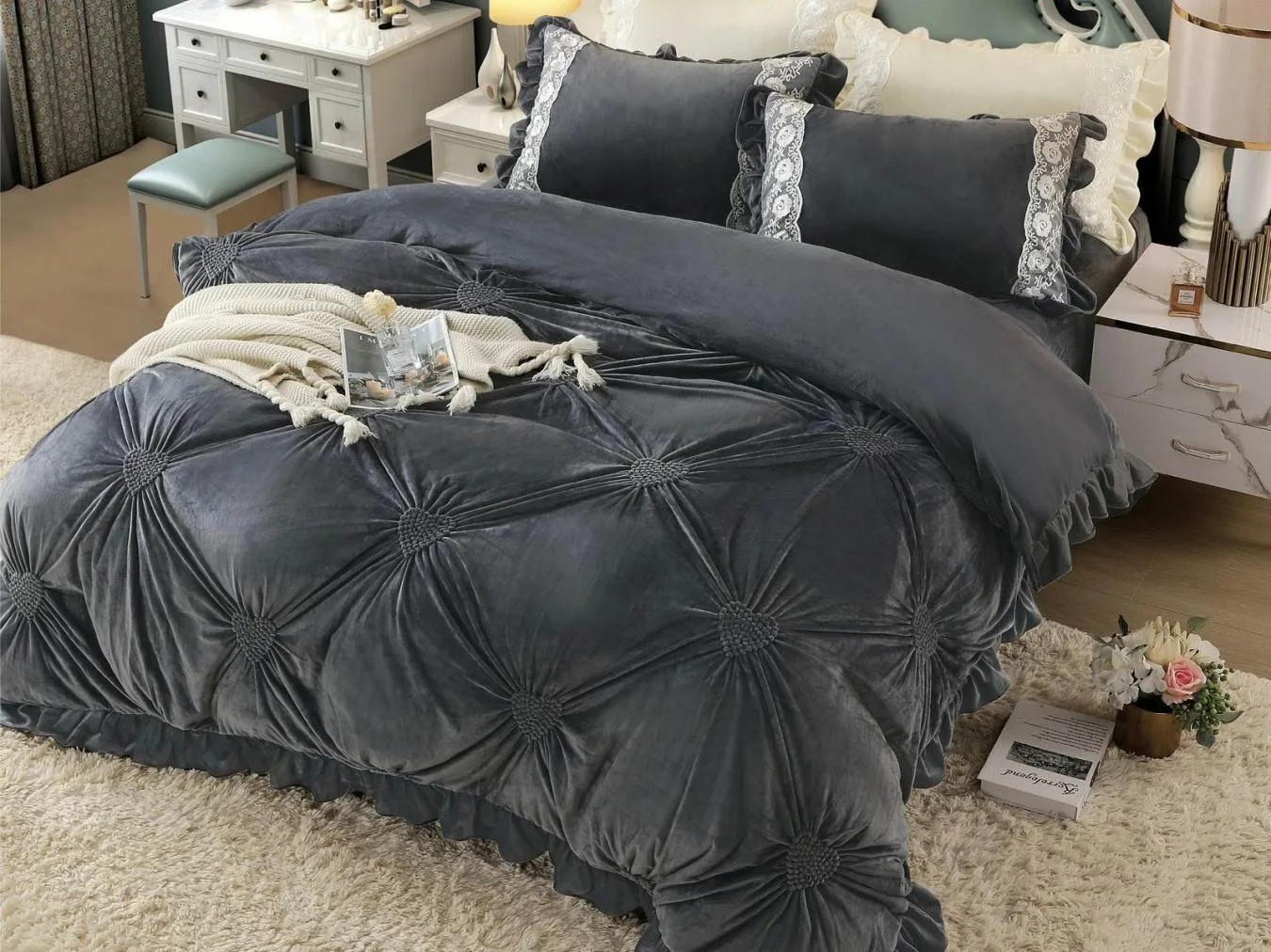 Lenjerie pufoasa din catifea cu 4 piese, pentru pat dublu, cu pliuri brodate in forma de inimioara, ce te invita la un somn relaxant, de la prima vedere.