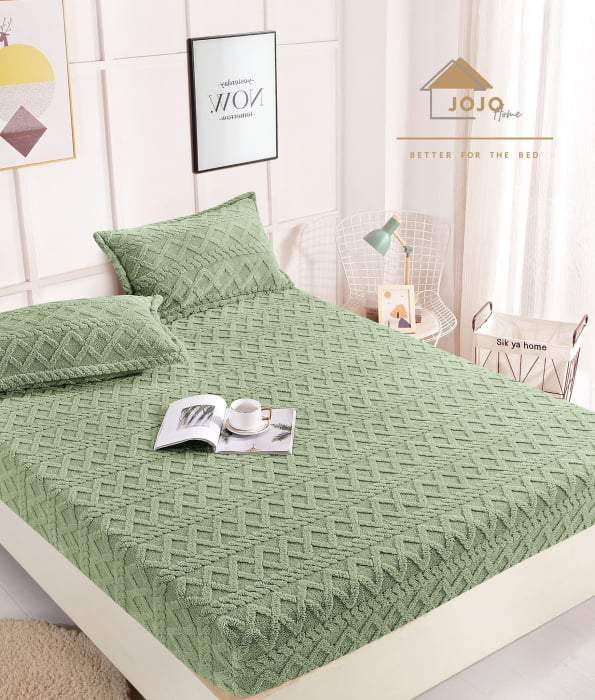 Husa cocolino cu elastic, 180x200x25cm, 2 fete de perne, Jojo Home, model Tricotat, Verde
