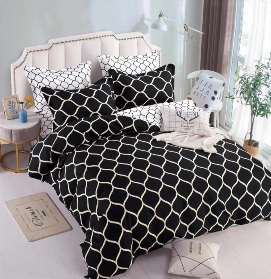 Lenjerie pat dublu, BUMBAC FINET, 6 piese, cu ELASTIC, Jojo Home, Negru-Alb, model elegant